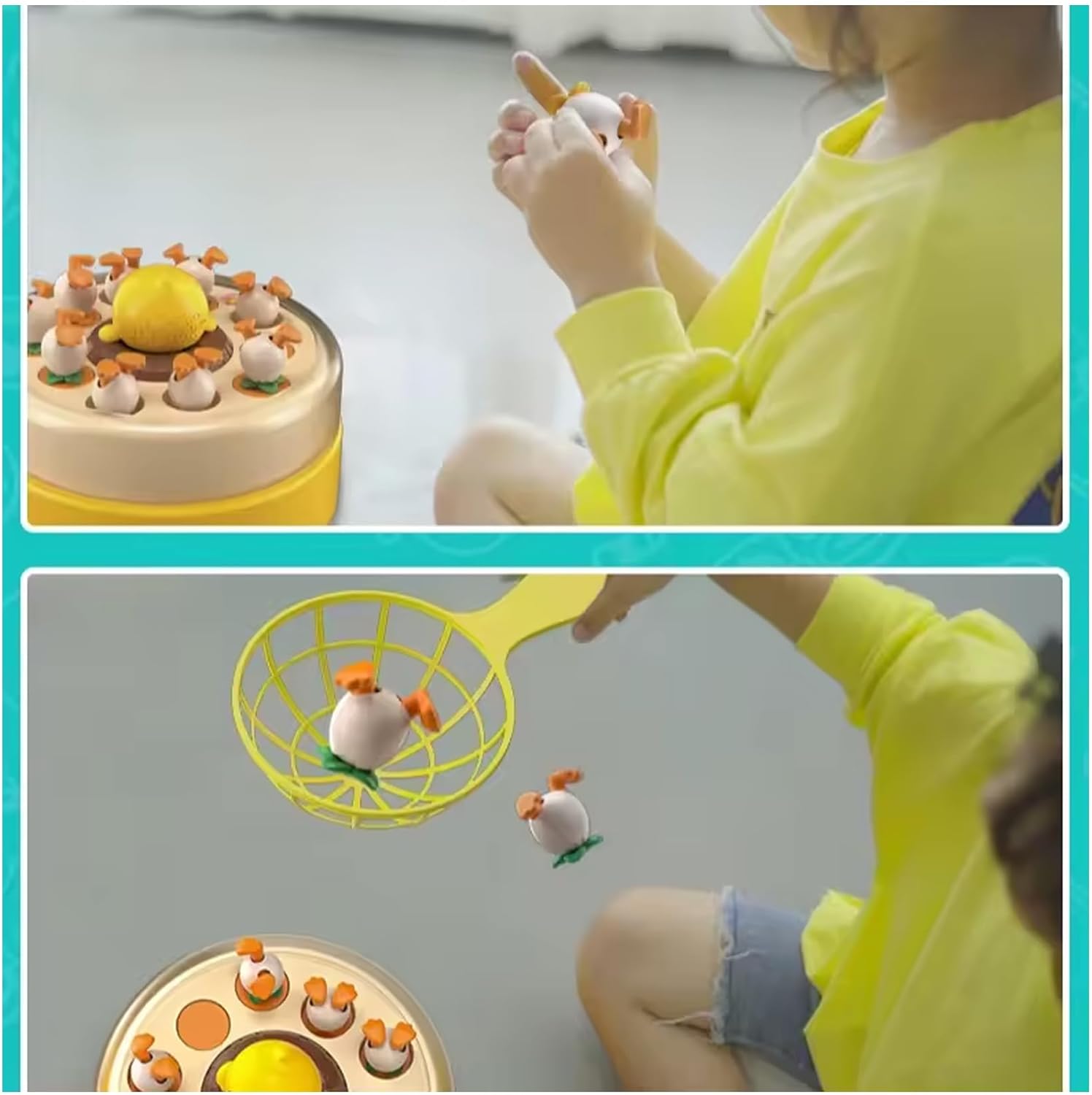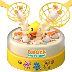 ما عليك سوى إدخال البطاريات ووضع البيض والبط على السبورة وتشغيلها. يبدأ البيض في الدوران والقفز بشكل عشوائي مع الموسيقى المبهجة – يحاول الأطفال الإمساك بهم بالشباك في تحد ممتع!